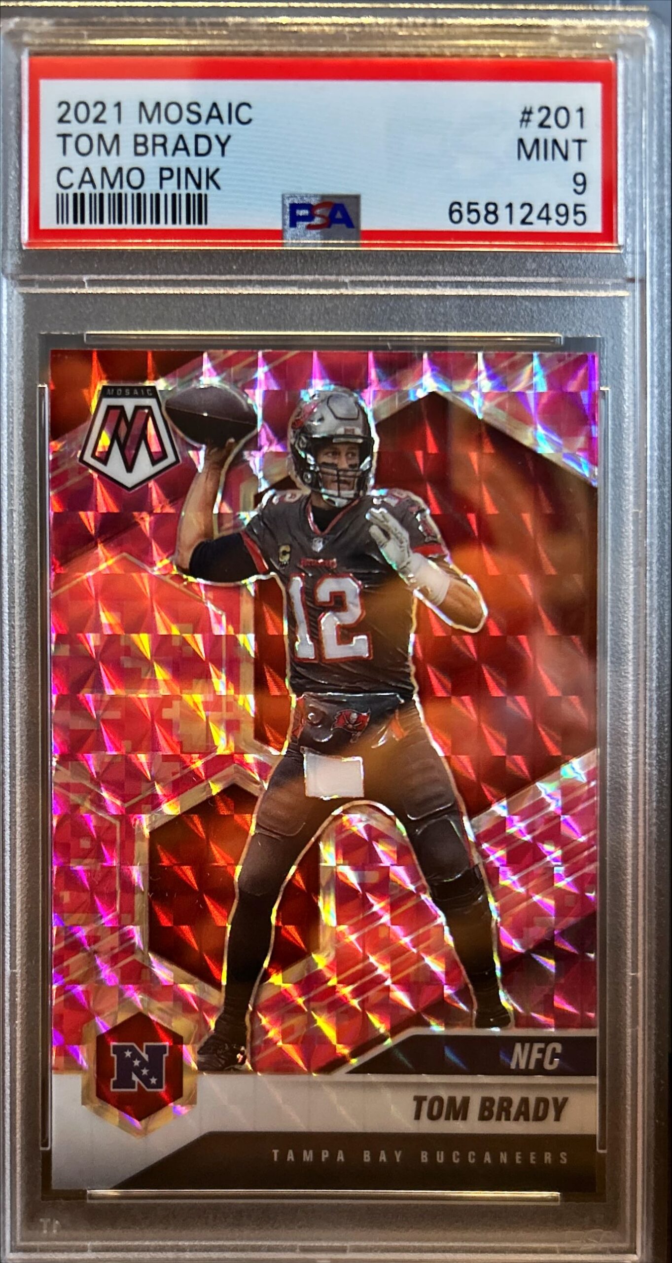 This is a nice example of a 2021 Panini Mosaic #201 Tom Brady Prizm Camo Pink